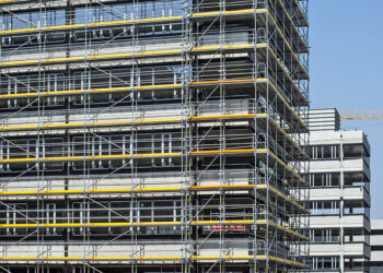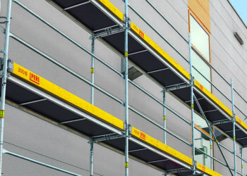 Los andamios de fachada se componen principalmente de una serie de postes verticales y horizontales interconectados entre sí. Esta estructura se suele completar con una plataforma sobre la que el operario puede realizar su trabajo de forma segura.